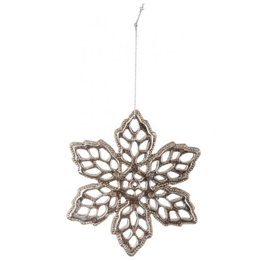 Piękna i bardzo estetyczna zawieszka przygotowana w formie ażurowego kwiatu poinsecji, w szampańskim kolorze. Jest ciekawym elementem dekoracyjnym wnętrza domu, nadającym delikatnego smaku i elegancji. Może też posłużyć jako zawieszka bożonarodzeniowego drzewka.