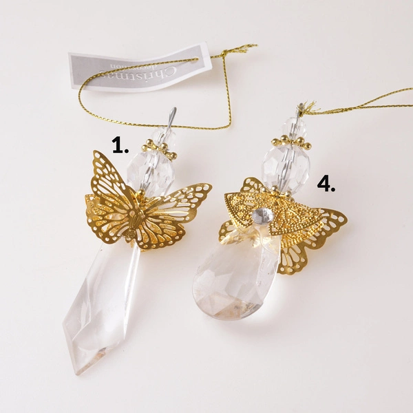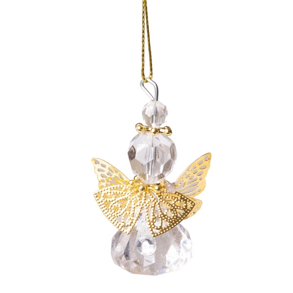 Zawieszka wykonana w formie aniołka ze złotymi skrzydłami. Wspaniała alternatywa dla klasycznych dekoracji choinkowych, wnosząca do wnętrza klimat magii świąt Bożego Narodzenia.