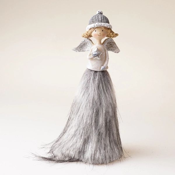 Sympatyczna figurka przedstawiająca aniołka w czapeczce trzymającego w dłoni srebrną gwiazdkę. Dziewczynka ubrana jest w spódnicę z futerka i ma srebrne skrzydełka. Stanowi doskonałą dekorację świąteczną i nie tylko.