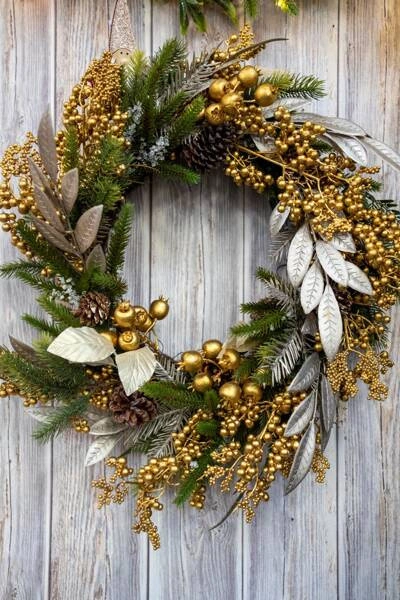 Dekoracja świąteczna w formie wianka, może być eksponowana na drzwiach, w oknie czy na stole. Może też służyć za podstawę stroika.