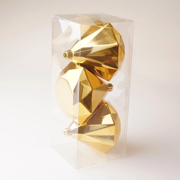 3 bombki choinkowe w kształcie złotych diamentów. Stanowią bardzo atrakcyjną formę dekoracji bożonarodzeniowego drzewka, podkreślającą klimat i nastrój świąt.