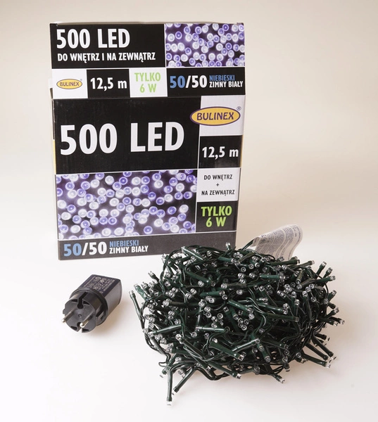 - Zestaw składa się z 500 drobnych, energooszczędnych lampek LED w kolorze niebieskim i zimnym białym.