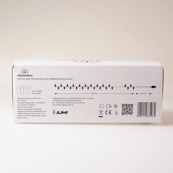 Oświetlenie świąteczne led sterowane aplikacją do stosowania zarówno wewnątrz jak i na zewnątrz składające się z 300 diodek ledowych świecących zimnym białym światłem.