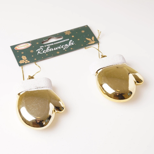 2 bombki choinkowe w formie złotych rękawiczek. Stanowią atrakcyjną formę dekoracji bożonarodzeniowego drzewka, podkreślającą klimat i nastrój świąt.