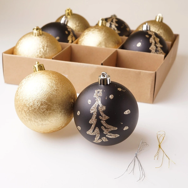 - Bombka 9szt 8cm złota/czarna brokatowa choinka