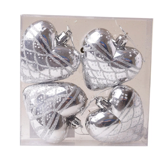Komplet 4 bombek choinkowych w kształcie srebrnych serc. Stanowią bardzo atrakcyjną formę dekoracji bożonarodzeniowego drzewka, podkreślającą klimat i nastrój świąt.