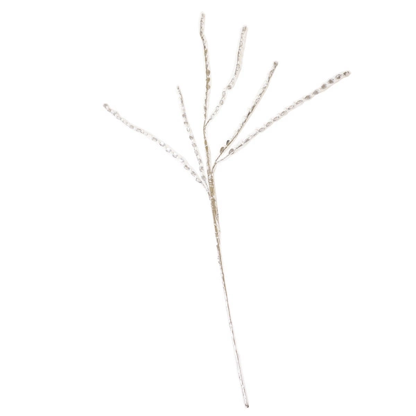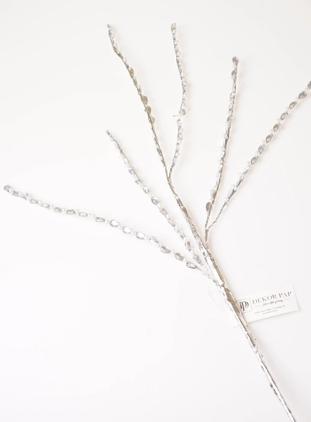 Sztuczna gałązka przygotowana w bardzo wyrazistej, a jednocześnie eleganckiej barwie - srebrnej. Posiada na swojej powierzchni małe sztuczne perełki i szkiełka. Świetnie komponuje się z okresem zimy i świąt Bożego Narodzenia. Może stanowić samodzielną ozdobę, lub stać się częścią większej kompozycji dekoracyjnej, np. przy stroikach.