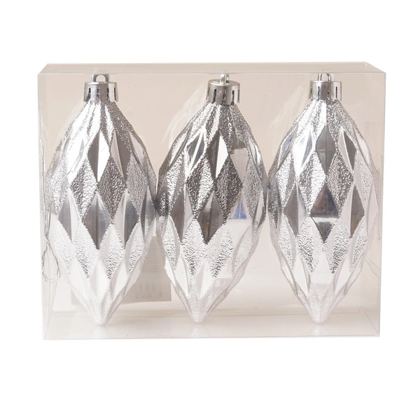 Bombka 3szt 10cm podłużna, romby srebrna