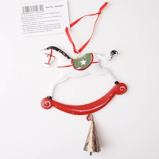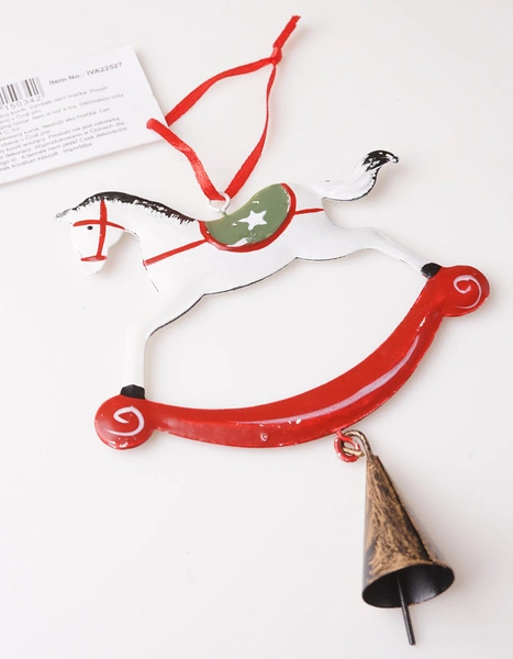 Starannie wykonana klasyczna zawieszka metalowa przedstawiająca konika na biegunach z dzwonkiem u dołu. Całość zawieszona na czerwonej wstążeczce. Stanowi atrakcyjną formę dekoracji bożonarodzeniowej, podkreślającą klimat i nastrój Świąt. Piękna :)