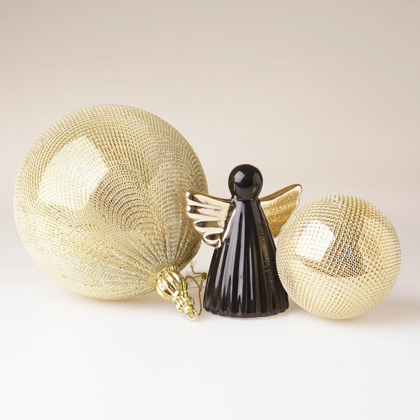 Bombka choinkowa w klasycznym, okrągłym kształcie. Przygotowana w złotym kolorze i udekorowana atrakcyjną siateczką. Stanowi wspaniałą formę dekoracji bożonarodzeniowego drzewka, podkreślającą klimat i nastrój świąt.