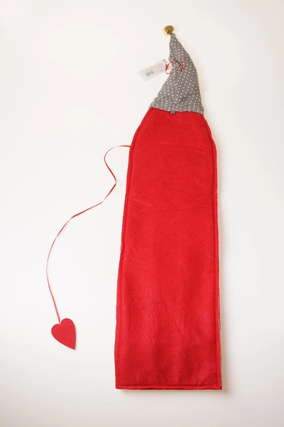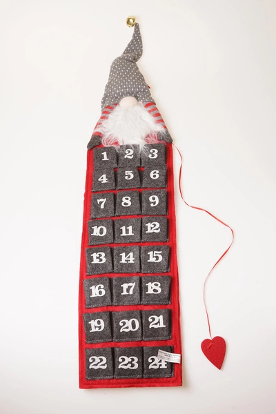 Kalendarz adwentowy wykonany z filcu w formie zawieszki. Przedstawia skrzata w szaro-czerwonej kolorystyce. Posiada miejsca do umieszczenia słodkich łakoci i innych drobiazgów.