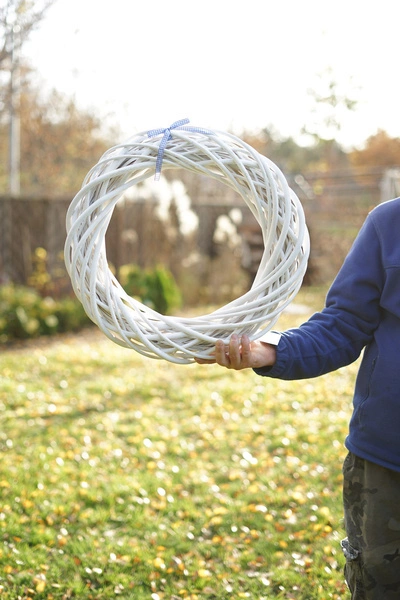 Bardzo ładny wianek na drzwi wykonany z pomalowanej na biało wikliny. Podkreśla klimat i magię świąt Bożego Narodzenia, tworząc odpowiednią dekorację. Może też służyć jako stroik. Nadaje się do zawieszenia bezpośrednio, lub po dodatkowym przybraniu go dekoracją.