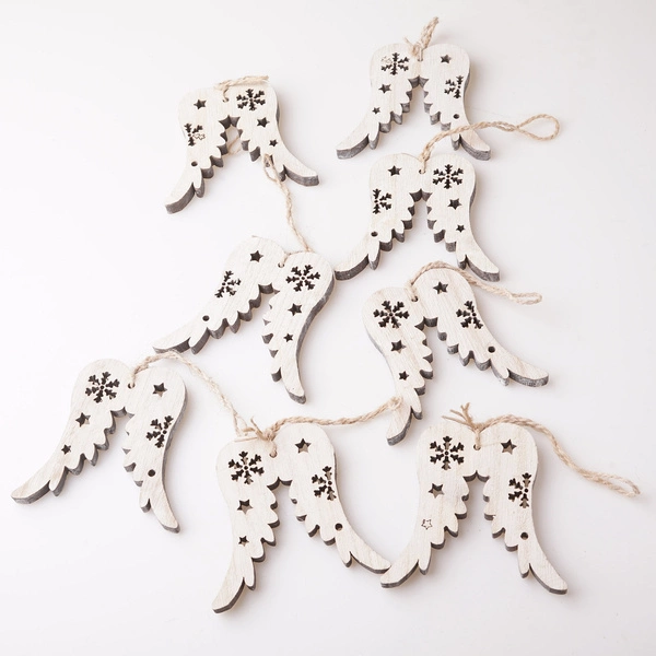 Komplet ośmiu drewnianych zawieszek w kształcie skrzydeł. Doskonale współgrają z okresem zimy i świąt Bożego Narodzenia.