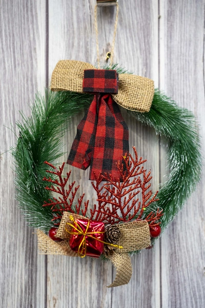 Zawieszka wianek świerk stroik z prezentem kokardą to subtelna dekoracja, która od pierwszego spojrzenia wprowadza świąteczny nastrój. Zielone, iglaste gałązki splecione w klasyczny wianek, ozdobione uroczym prezentem i czerwoną kokardą, zachwycają naturalnym wyglądem i elegancją. Ta dekoracja z łatwością wpasuje się w przytulne, zimowe aranżacje – zarówno w klasycznym, jak i nowoczesnym stylu. Idealnie sprawdzi się jako akcent na drzwiach, ścianie lub w oknie, tworząc wyjątkową atmosferę w Twoim domu.