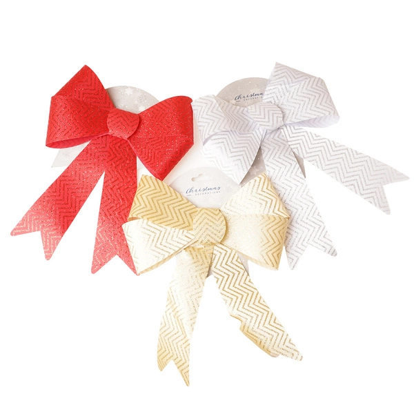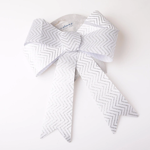 Srebrna kokarda na choinkę z brokatowymi zygzakami. Piękny pomysł na udekorowanie domu, zwłaszcza w okresie zimy i Świąt Bożego Narodzenia.