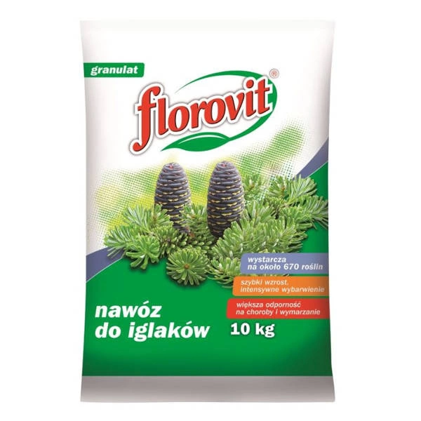 Nawóz do roślin iglastych 10kg Florovit przeznaczony jest do nawożenia drzew i krzewów iglastych, takich jak cisy, modrzewie, cyprysy, świerki, sosny, jodły oraz innych roślin ozdobnych. Doskonale sprawdza się także przy zasilaniu krzewów liściastych, np. forsycji, migdałków, drzew liściastych oraz orzechów włoskich i laskowych. Regularne stosowanie nawozu wspiera zdrowy wzrost, piękne wybarwienie oraz odporność roślin na niekorzystne warunki atmosferyczne.