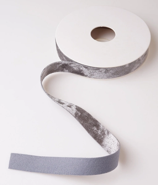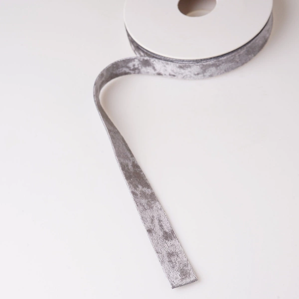 Aksamitna tasiemka materiałowa w kolorze jasnoszarym. Można ją stosować w dekoracjach, wykończeniach odzieżowych czy chociażby do przewiązywania prezentów.