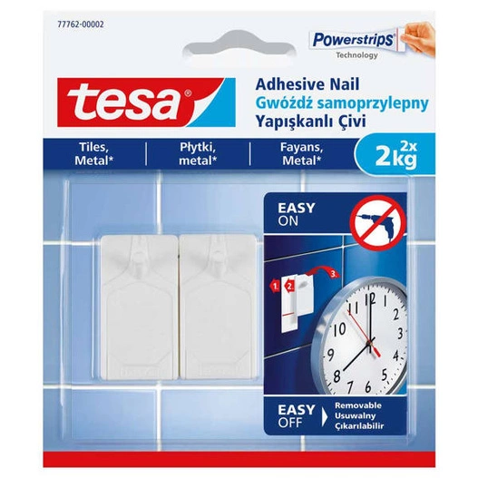 Gwóźdź samoprzylepny przygotowany przez firmę Tesa, to świetne rozwiązanie dla każdego kto nie chce wiercić w w ścianie, a potrzebuje zawiesić obrazek lub inne drobne elementy. Gwóźdź jest w stanie utrzymać ciężar do 2 kg i przeznaczony jest do zastosowania na płytkach, metalu i innych gładkich powierzchniach. Po usunięciu nie pozostawia śladu.