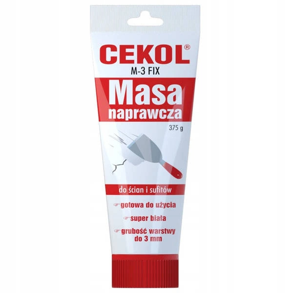 Masa naprawcza M-3 Fix 375g Cekol to gotowy do użycia produkt, który sprawdzi się wszędzie tam, gdzie potrzebujesz szybkiej i precyzyjnej naprawy niewielkich ubytków w ścianach lub sufitach. Dzięki wysokiej przyczepności do podłoży mineralnych i powłok malarskich, masa pozwala na łatwe wygładzanie powierzchni przed malowaniem. Biała barwa i możliwość nakładania warstw do 3 mm sprawiają, że produkt jest niezwykle uniwersalny i wygodny w użyciu podczas prac wykończeniowych w każdym wnętrzu.
