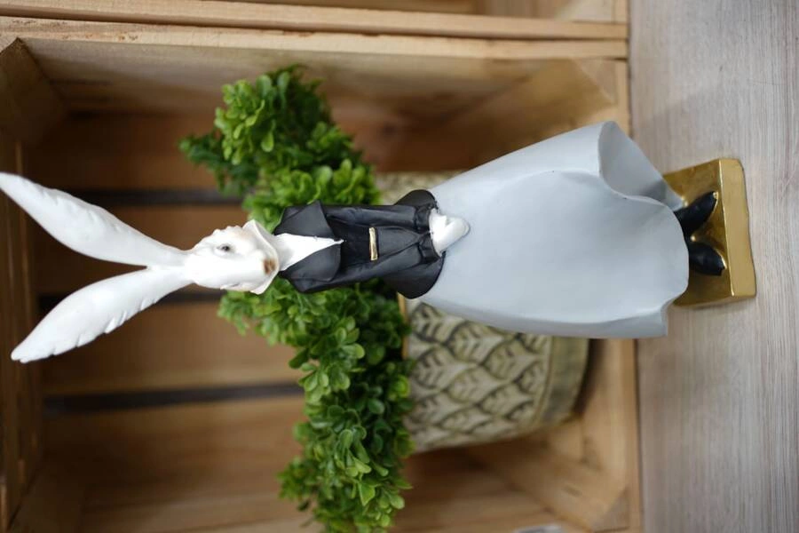 Dekoracja przygotowana w formie figurki przedstawiającej zajączka w białej sukni i czarnej marynarce. To bardzo atrakcyjna dekoracja, która wprowadza do wnętrza wspaniałą atmosferę. Bardzo ładnie komponują się z okresem wiosny i czasem Wielkanocy.