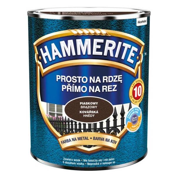 Hammerite Prosto na Rdzę o efekcie młotkowym jest to jednoskładnikowa farba przeznaczona do antykorozyjnego i dekoracyjnego malowania metali, zarówno tych już pokrytych rdzą, jak i czystych.