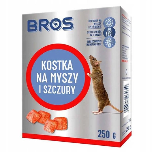 Kostka na myszy i szczury 250g Bros przeznaczona jest do zwalczania gryzoni w miejscach takich jak piwnice, garaże, kuchnie, pomieszczenia gospodarcze, magazyny, a także na terenach zewnętrznych wokół budynków mieszkalnych i gospodarczych.