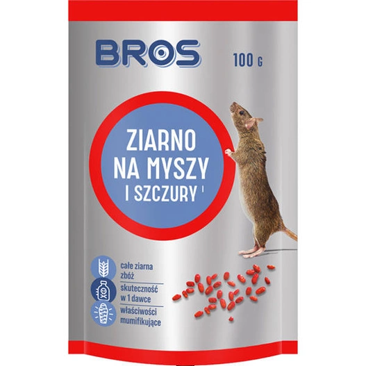 Ziarno na myszy i szczury 100g Bros to nowoczesna i skuteczna trutka w formie apetycznego ziarna, stworzona specjalnie do zwalczania myszy i szczurów. Zawiera silnie wabiącą przynętę, dzięki czemu jest wyjątkowo atrakcyjna dla gryzoni. Produkt działa już po jednokrotnym spożyciu, eliminując szkodniki w sposób niezawodny i dyskretny. Opóźnione działanie sprawia, że gryzonie nie kojarzą trutki z zagrożeniem. Specjalnie dobrane, całe ziarna zbóż oraz właściwości mumifikujące zapewniają wysoką skuteczność i bezpieczeństwo użytkowania.