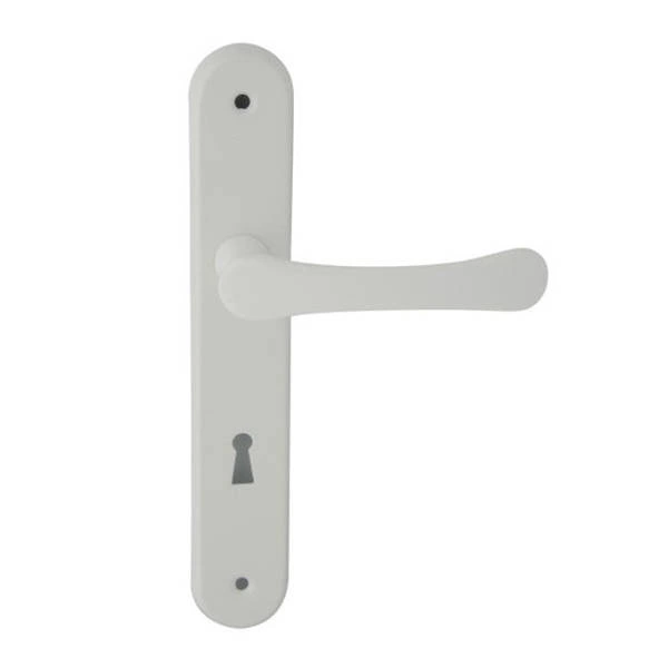 Klasyczna klamka wewnętrzna, przygotowana w białym kolorze. To element wnętrz, który stanowi zwieńczenie drzwi, będąc jednocześnie elementem o funkcji praktycznej.