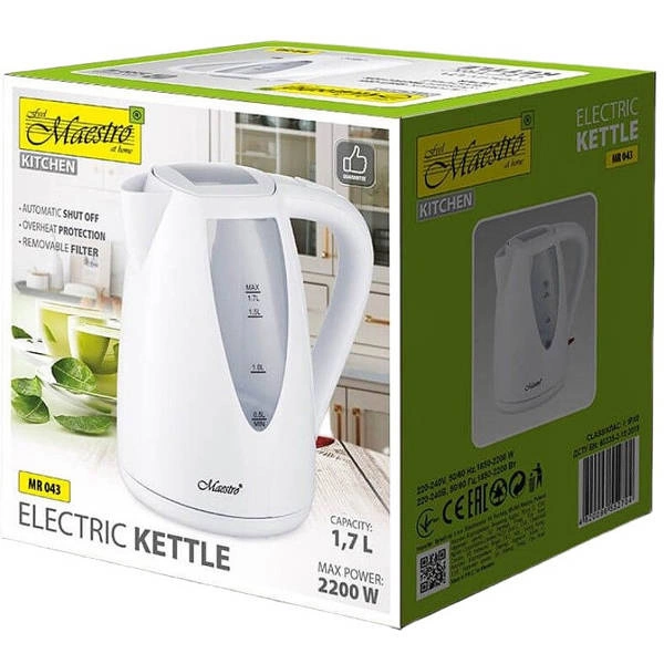 Czajnik elektryczny 1,7L Maestro Kremowy to połączenie funkcjonalności, nowoczesnej technologii i ponadczasowej elegancji. Dzięki dużej pojemności 1,7 litra oraz mocy 2200W błyskawicznie zagotujesz wodę na kawę, herbatę czy posiłki instant dla całej rodziny. Kremowa obudowa sprawia, że czajnik doskonale prezentuje się w każdej kuchni, a płaska grzałka oraz obrotowa podstawa gwarantują wygodę użytkowania i łatwe utrzymanie czystości. Dodatkowe zabezpieczenia, takie jak ochrona przed przegrzaniem i filtr, zapewniają bezpieczeństwo oraz wysoką jakość gotowanej wody.