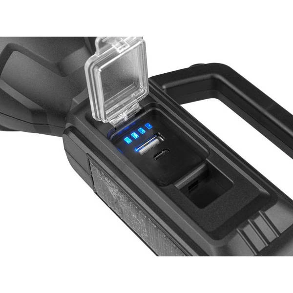 Dodatkowo, latarkę wyposażono w panel solarny, który umożliwia ekologiczne naładowanie akumulatora. O stopniu naładowania poinformuje nas panel świetlny, wskazujący poziom mocy.