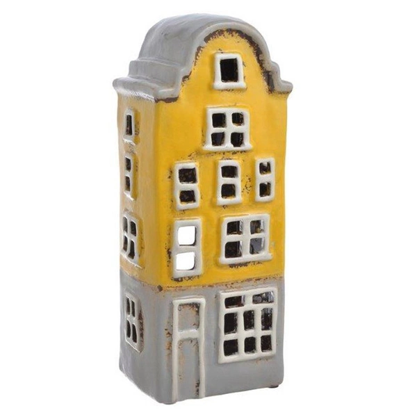 Domek kamienica 3 piętrowa T-light ceramika żółta to uroczy, ceramiczny lampion w formie wysokiej, miejskiej kamienicy. Delikatnie połyskująca ceramika w odcieniach żółci i szarości, z białymi okiennicami i szarym daszkiem, tworzy dekorację, która od razu kojarzy się z ciepłem domowego ogniska.