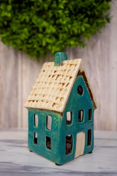 Piękny lampion - domek ceramiczny, przygotowany w formie małej kamieniczki, w atrakcyjnej kolorystyce - połączeniu zieleni i barwy kremowej.