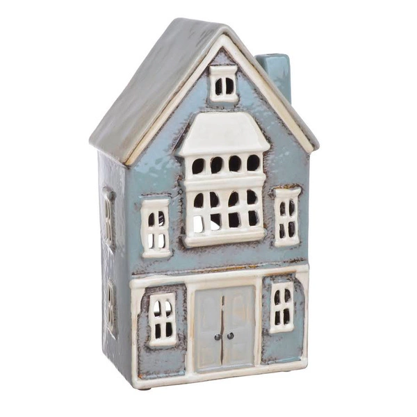 Domek T-light ceramika jasny niebieski i szary dach lampion świecznik