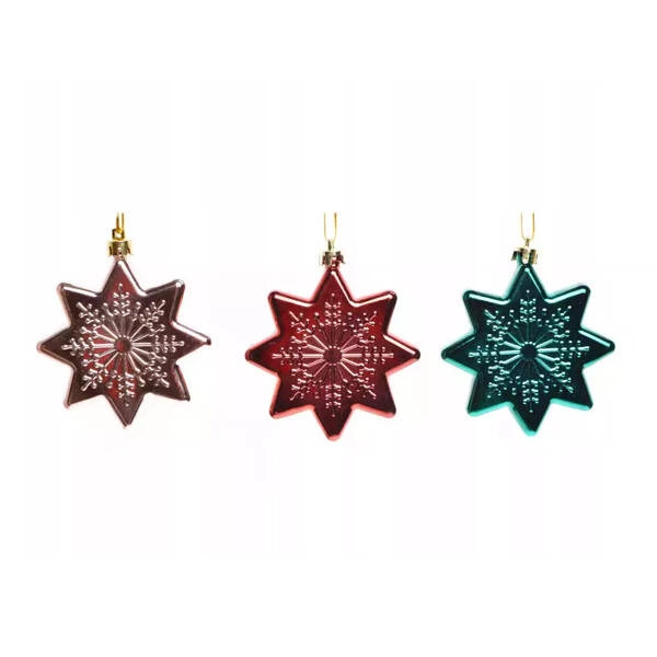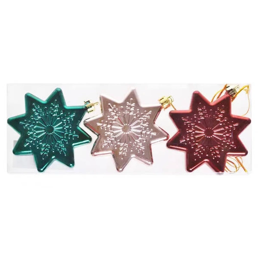 - Zestaw zawiera trzy bombki w kształcie gwiazdek, każda w innym, żywym kolorze.