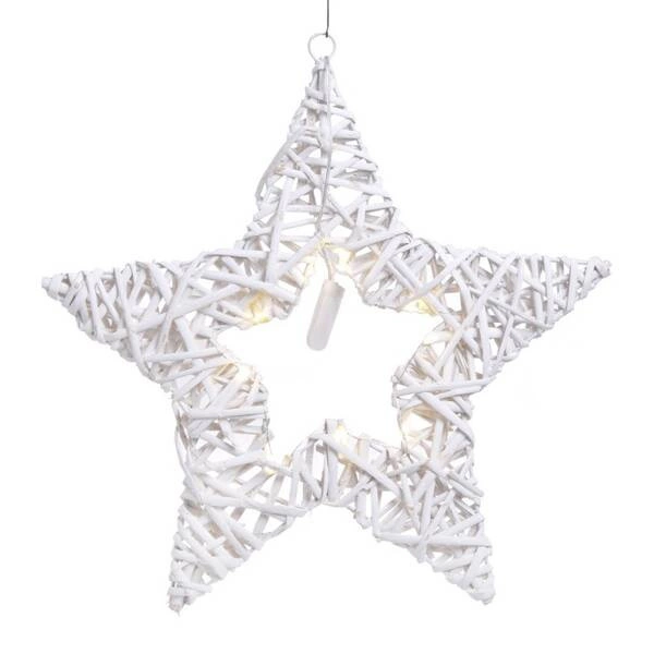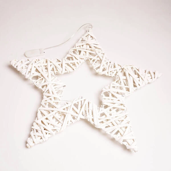 Klasyczna gwiazda w formie zawieszki. Wykonana została z rattanu, malowanego na biało, oraz wyposażona w sznur do zawieszania i LED-owe oświetlenie. Jest atrakcyjną formą dekoracji wnętrza, która nabiera mocy i charakteru zimą oraz w czasie świąt Bożego Narodzenia.