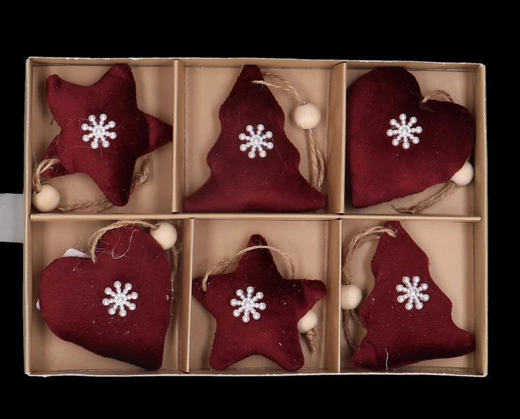 Zawieszki aksamitne bordowe 6cm 6sztuk to prawdziwa ozdoba każdego domu, która natychmiast przyciąga wzrok swoim szlachetnym kolorem i miękką, przyjemną w dotyku fakturą. Każda z nich to drobny akcent, który wprowadza do wnętrza wyjątkowy, świąteczny nastrój i sprawia, że przestrzeń staje się bardziej przytulna. Bordowy aksamit pięknie odbija światło, nadając dekoracjom subtelnego blasku i elegancji. Zestaw zawiera 6 różnorodnych kształtów, które można dowolnie komponować na choince, stroiku lub w oknie, tworząc niepowtarzalną, pełną uroku aranżację.