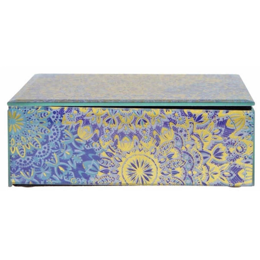 Bardzo atrakcyjna wizualnie szkatułka na biżuterię, przygotowana podłużnej formie i ozdobiona piękną mozaiką w odcieniach niebieskiego koloru. Jest wspaniałą dekoracją wnętrza, która jednocześnie zapewnia praktyczne zastosowanie w postaci schowka na biżuterię lub inne drobne elementy.