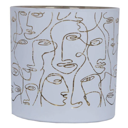 Świecznik szklany przygotowany w pięknym, czysto-białym kolorze i ozdobiony złotymi twarzami.