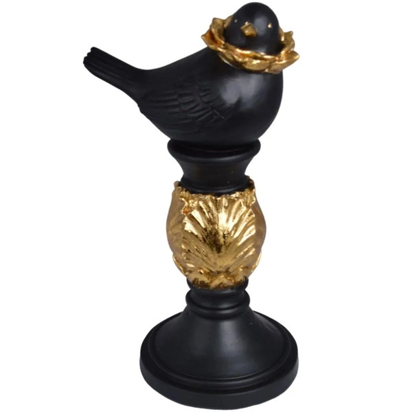 Figurka, która przedstawia ptaka na kolumnie. Wszystko utrzymane zostało w kolorach stonowanych, eleganckich - połączeniu czerni i złota. Jest to dekoracja, która sprawdzi się w każdym wnętrzu, wnosząc do niego charakter i klimat.