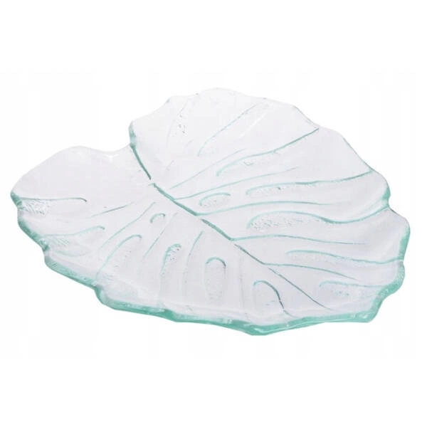 Dekoracyjny talerz przygotowany z bezbarwnego szkła i uformowany w liść monstery. Piękna dekoracja, która może służyć np. do ekspozycji owoców, warzyw czy słodyczy.