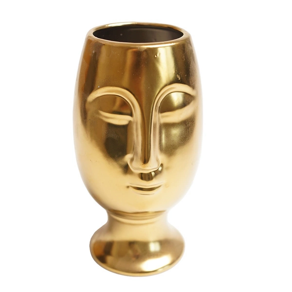 Dekoracyjny wazonik w kształcie głowy o matowym, złotym wykończeniu i wysokości 20 cm to stylowy element wystroju, który przyciąga uwagę swoim oryginalnym designem. Doskonale sprawdzi się jako nowoczesna ozdoba na komodzie, regale czy stoliku. Może pełnić funkcję zarówno wazonu na kwiaty, jak i artystycznego. Matowa powierzchnia dodaje elegancji i subtelności, dzięki czemu wazonik harmonijnie wpisuje się w różne aranżacje. Idealny na prezent dla osób ceniących unikalne dodatki do domu.