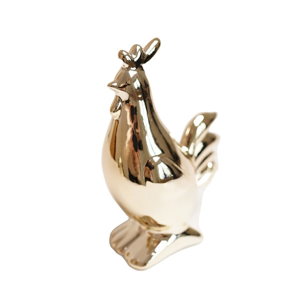 Figurka przedstawiająca koguta, wykonana z ceramiki w złotym, lustrzanym kolorze. To doskonały pomysł na atrakcyjną aranżację wnętrza, z wykorzystaniem klasycznego ale nie szablonowego motywu.