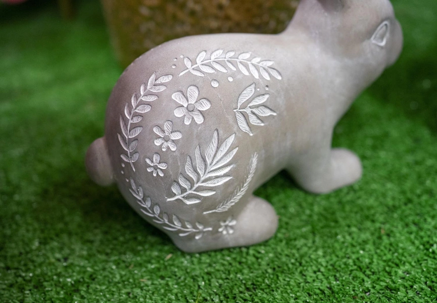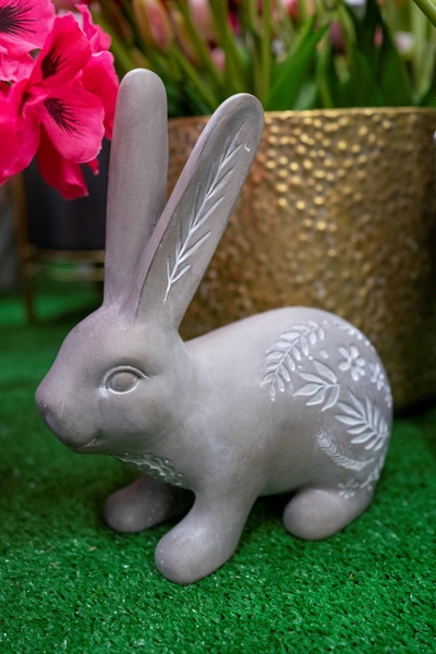 Figurka przedstawiająca zajączka, w szarym, betonowym kolorze, lekko bielonego i ozdobionego ślicznym, kwiatowym motywem. Jest dekoracją, która wprowadza do wnętrza niepowtarzalny nastrój, stając się jego oryginalnym uzupełnieniem. Jest to też bardzo klasyczna ozdoba Wielkanocna.