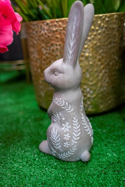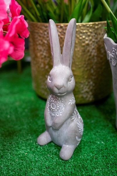 Figurka przedstawiająca zajączka, w szarym, betonowym kolorze, lekko bielonego i ozdobionego ślicznym motywem mandali. Jest dekoracją, która wprowadza do wnętrza niepowtarzalny nastrój, stając się jego oryginalnym uzupełnieniem. Jest to też bardzo klasyczna ozdoba Wielkanocna.