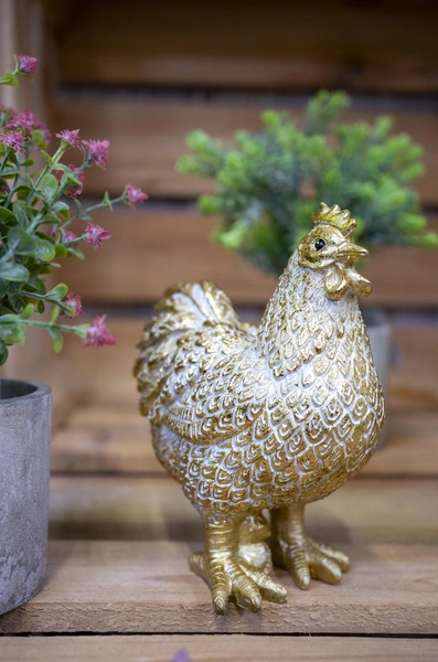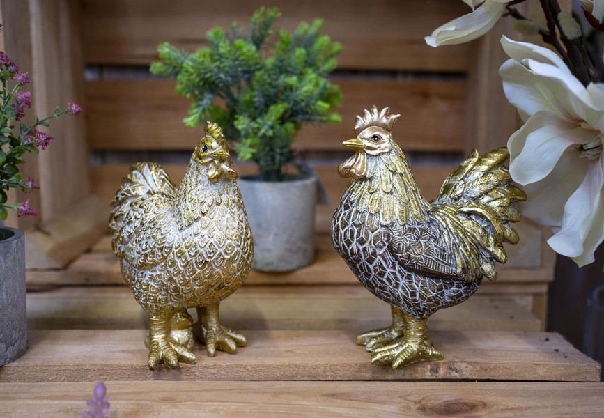 Dekoracja przygotowana w formie pięknej figurki. Pozwoli na aranżację wnętrza w okresie świąt Wielkanocy. Bardzo starannie wykonana, przedstawia kurę, utrzymanego w kolorystyce złota i bieli. Nadaje wyjątkowego klimatu każdej przestrzeni domowej.