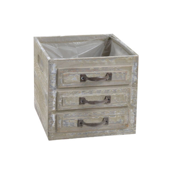 Osłonka w pięknie szarym kolorze, przycieranym. Przygotowano ją w kształcie mebla z szufladami, co tworzy wspaniałą dekorację i doskonałą podstawę dla upraw. Pozwala na atrakcyjną ekspozycję roślin, budując dekorację wnętrza, która znacząco wpływa na jego klimat.