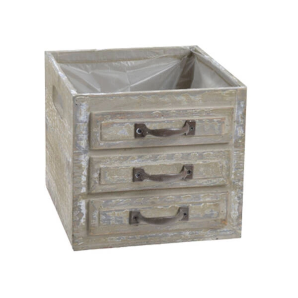 Osłonka w pięknie szarym kolorze, przycieranym. Przygotowano ją w kształcie mebla z szufladami, co tworzy wspaniałą dekorację i doskonałą podstawę dla upraw. Pozwala na atrakcyjną ekspozycję roślin, budując dekorację wnętrza, która znacząco wpływa na jego klimat.