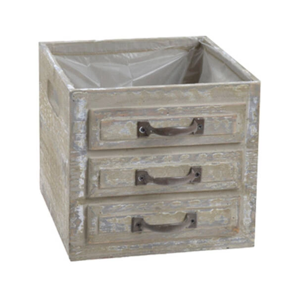 Osłonka w pięknie szarym kolorze, przycieranym. Przygotowano ją w kształcie mebla z szufladami, co tworzy wspaniałą dekorację i doskonałą podstawę dla upraw. Pozwala na atrakcyjną ekspozycję roślin, budując dekorację wnętrza, która znacząco wpływa na jego klimat.