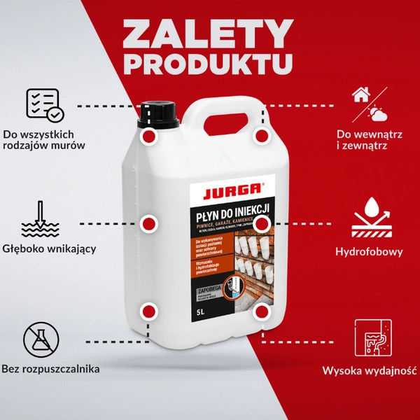 Płyn do iniekcji Jurga 5L+Lejki białe 6 sztuk sprawdzi się w zabezpieczaniu murów przed wilgocią w piwnicach, garażach, altanach, a także w pomieszczeniach użytkowych i mieszkalnych. Produkt idealny do wykonywania poziomej izolacji przeciwwilgociowej, naprawy istniejących izolacji oraz ochrony powierzchni przed wysoleniami i wykwitami.