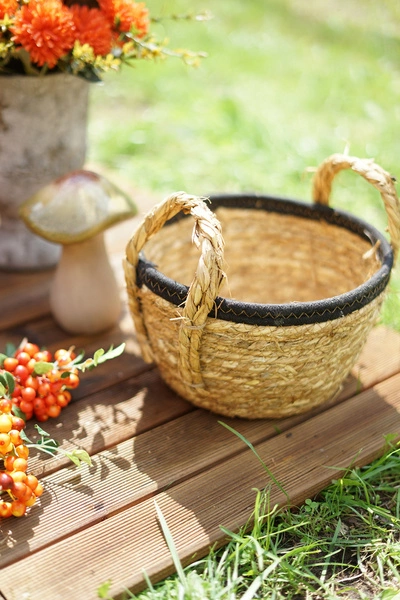 Piękny naturalny pleciony kosz z rączkami wykonany z trawy morskiej. Pomysł na wyjątkową osłonę do kwiatów albo sposób na przechowywanie domowych drobiazgów.